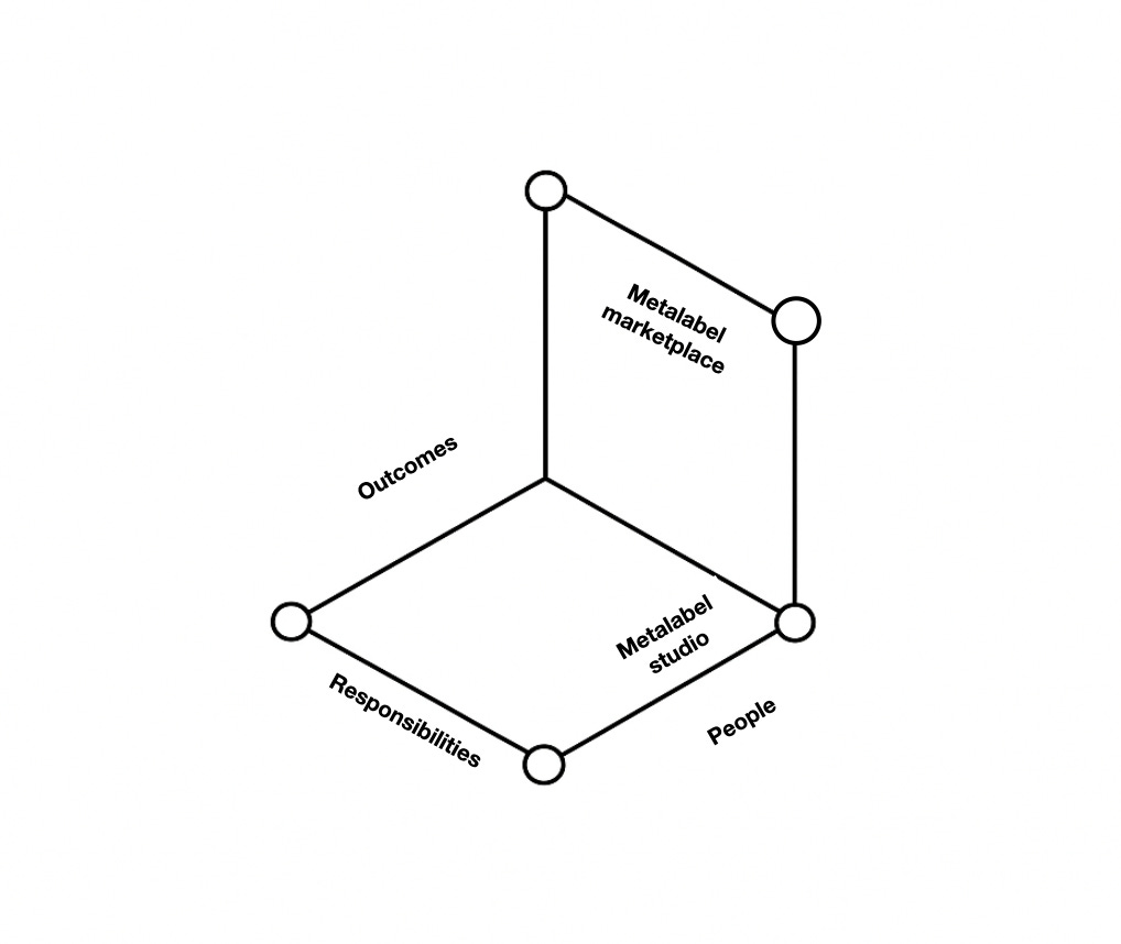 In this diagram, the center node is Metalabel Studio – the core group and heterarchy where decisions are made, ideas are shaped, and responsibility is ultimately held.